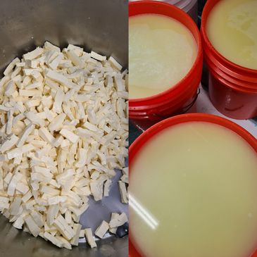 After the milk is heated and coagulated, it is separated into curds and whey. The curds are then cut and drained to remove excess whey. We then give our whey to our pigs and spread the rest onto our fields for added nutrients.
